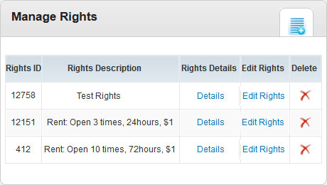 On the left side of My Account panel, please click the Rights link. In the Rights page, you will see two sample rights which DRM-X platform has created for you. Click Edit Rights, you will be able to see rights in details and edit rights settings.