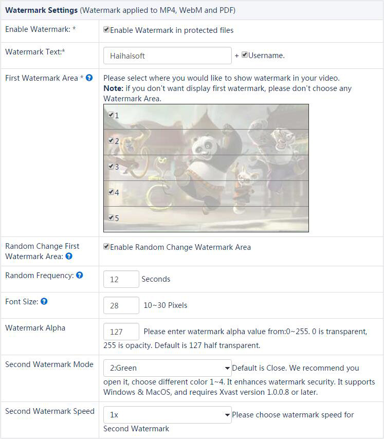 Dynamic Watermark can show users' personal information. For example, user's mobile phone number, passport number, user id and so on. It's not for showing your company logo. Your company logo can be directly encode into videos. Dynamic Watermark can be used for Legal evidence purpose. People won't record the video when they see their mobile phone number or passport number showing on it. For watermark settings, please select Username. When you create user in DRM-X 4.0 Account, you can use user's mobile phone number as Username. You can also integrate with your web site and customize watermark text. We recommend that you open Second Watermark. You can choose different watermark color 1~4. It enhances watermark security. It supports Windows & MacOS, and requires Xvast version 1.0.0.8.