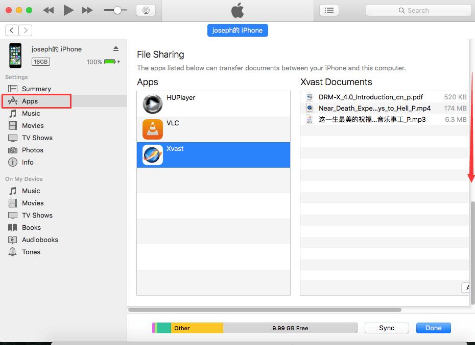 Step 3:Click "Apps" option, in Apps section, scroll down to the bottom of the page, Find "File Sharing" in "Apps", then find "Xvast" in "Files Sharing". In the right-bottom of the window, click the "Add…" button to add MP4 video, MP3 audio or PDF files.