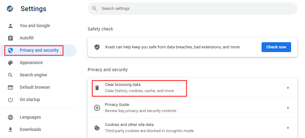 Open Xvast browser, in Menu->Settings, "Privacy and security", and click "Clear browsing data..." :