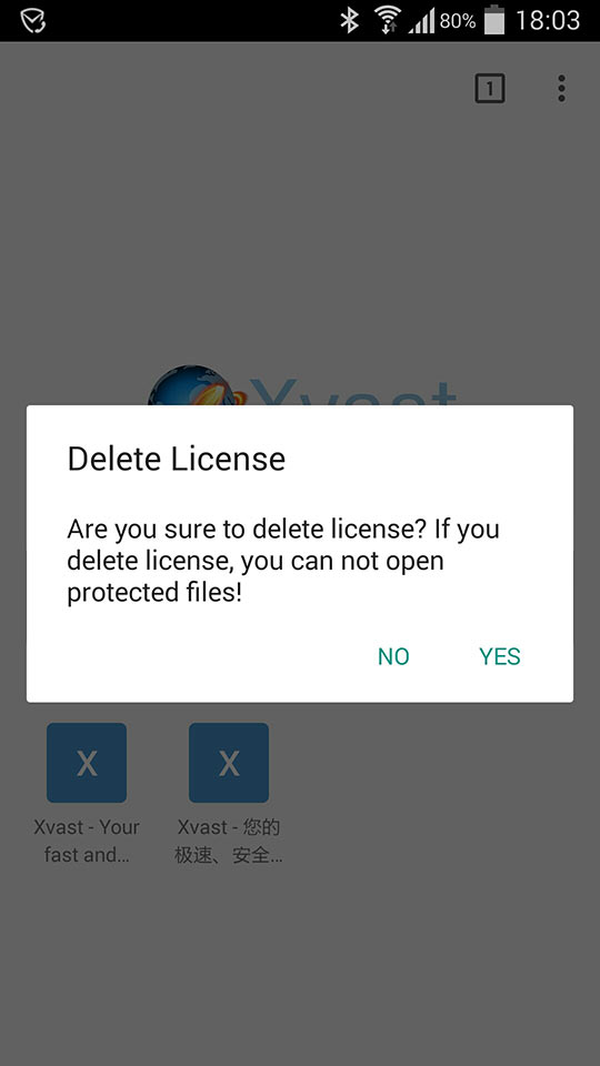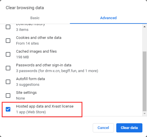 Select "Hosted app data and Xvast license" and click "Clear data" button.