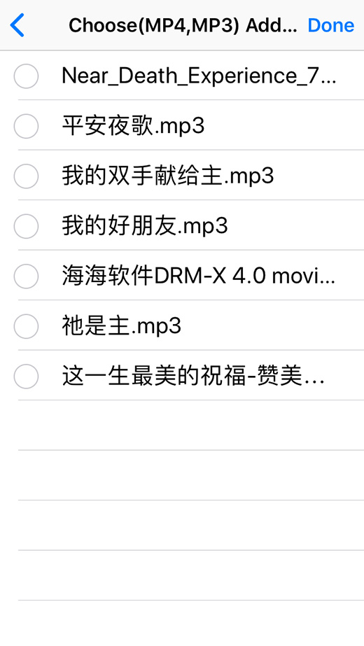 Select the file you want to add then click "Done". (You can use iTunes to sync file to Xvast or download MP3, MP4 file by Xvast.)