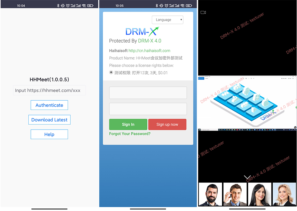 You only need to set up the Zoom SDK, meeting ID and password in the DRM-X 4.0 license profile to quickly encrypt and protect the Zoom video meeting. After download and install the HHMeet app, users only need to paste the HHMeet meeting URL to join the protected Zoom video meeting.