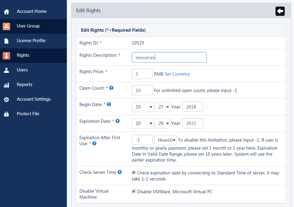 Login to the newly registered DRM-X 4.0 account, In the DRM-X 4.0 Control Panel, first we click "Rights" to add a new rights. Set Rights Description, Rights Price, Open count, Expiration After First Use, Protect document, Not Allow Print, enable watermark. You can set the watermark content to prevent piracy. Dynamic watermarking supports two modes of display. The first way is to set the watermark's position and frequency of change. The second type of watermark display is a marquee effect with a higher level of security.