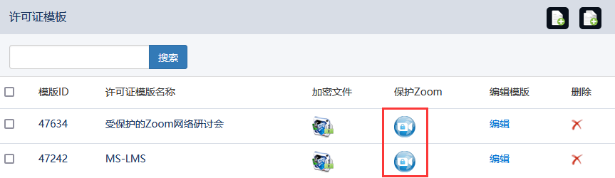 登录您的 DRM-X 4.0 帐户,在 [许可证模板] 页面上创建许可证模板,然后单击 [保护 Zoom] 下的图标来设置 Zoom 网络研讨会加密。