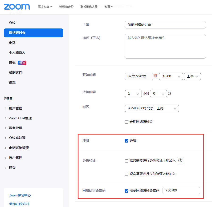 在以下设置中,请选择“登记”和 ”需要网络研讨会密码,请勿选择验证设置完成后,点击“日程“ 按钮。
