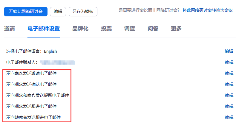 点击“日程点击“按钮”,您需要进行一项非常重要的设置。电子邮件设置下方,并设置为不向任何人发送电子邮件通知。编辑向小组成员发送邀请邮件“,“注册成功后,系统会向注册者发送确认邮件。 “电子邮件通知功能已关闭,以防止用户通过其他方式加入网络研讨会。”