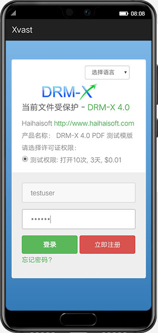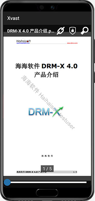 使用海海软件的 DRM-X 4.0 加密平台加密的 PDF 文档可以安全地分发到安卓设备。用户阅读加密的 PDF 文档时,Xvast 浏览器会禁止截屏。您还可以通过 DRM-X 4.0 的权限设置,为加密文件添加数字水印。用户信息将以对角线方式显示在屏幕上。DRM-X 4.0 加密技术,为您的文档内容提供安全的阅读环境。