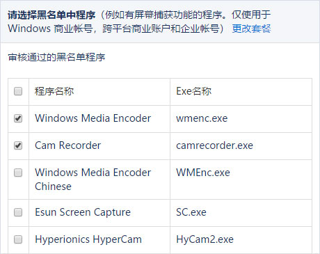 DRM-X 4.0 继承了 3.0 的黑名单防录屏功能。通过设置黑名单程序,可以有效阻止黑名单程序进行录屏或截图操作。当用户打开受保护的文件时,如果 Xvast 检测到黑名单程序正在运行,Xvast 将立即阻止该程序的进程。目前,黑名单程序包含数百种录屏和截图程序。