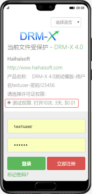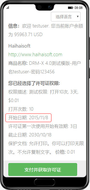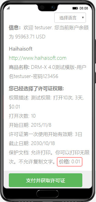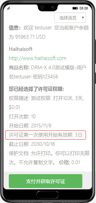通过在“权限”中设置权限描述,用户可以快速了解即将获得的许可证信息。例如,您可以显示权限的有效期、允许打开的次数、费用、是否允许打印以及允许打印的次数。