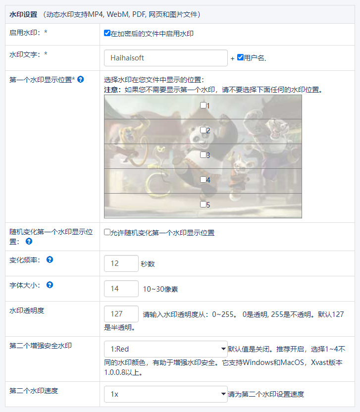 DRM-X 4.0 动态水印支持两种显示模式。第一种模式是设置水印的位置和变化频率。第二种水印显示方式是跑马灯效果,安全性更高。